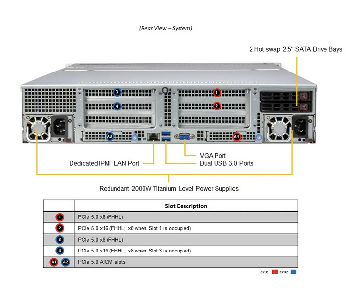 Two PCIe 5.0 x16 slots & two PCIe x8 slots and two AIOM connectors (OCP 3.0 SFF compliant)